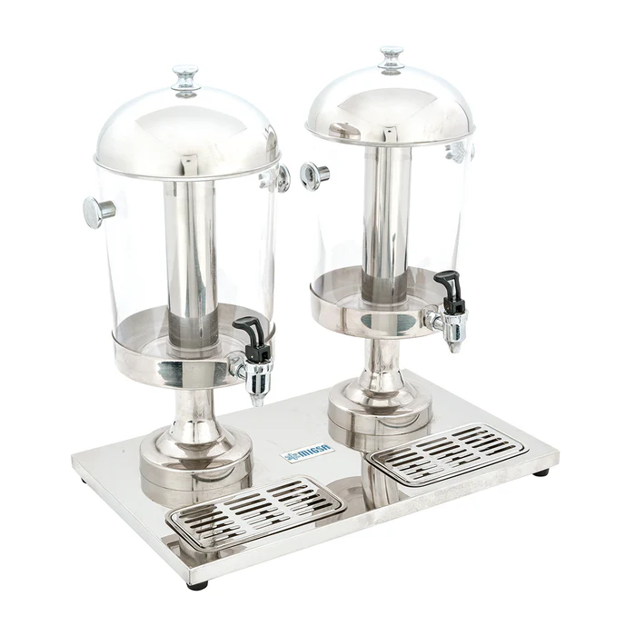 Fabricado en acero inoxidable y acrílico. Capacidad de 8 l c/u. Tubo intermedio para hielo independiente. Charola de residuos. Base. Peso de 7.9 kg.