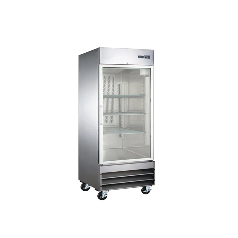 - Refrigerador vertical de 1 puerta de cristal fabricado en interior y exterior de acero inoxidable, respaldo de aluminio.